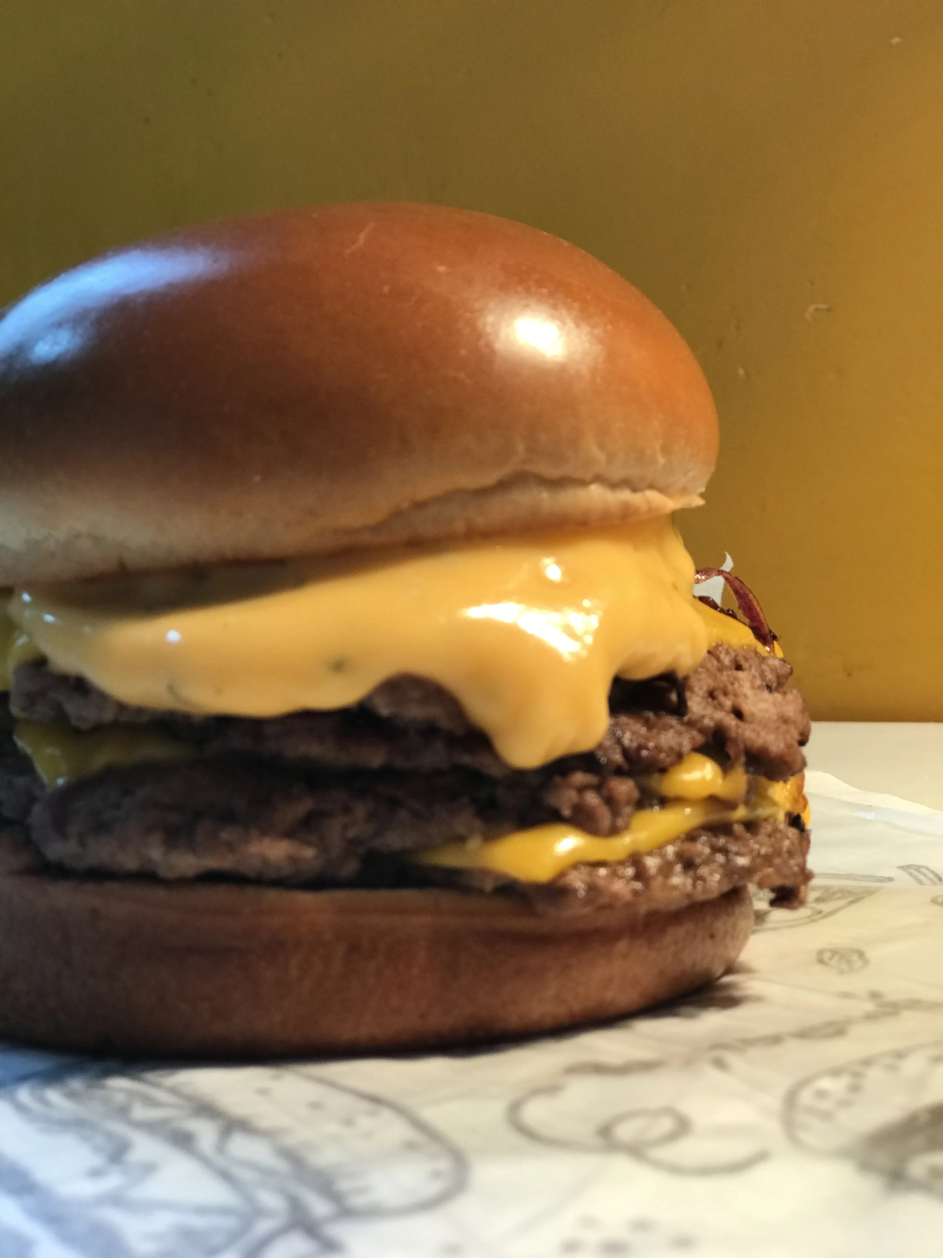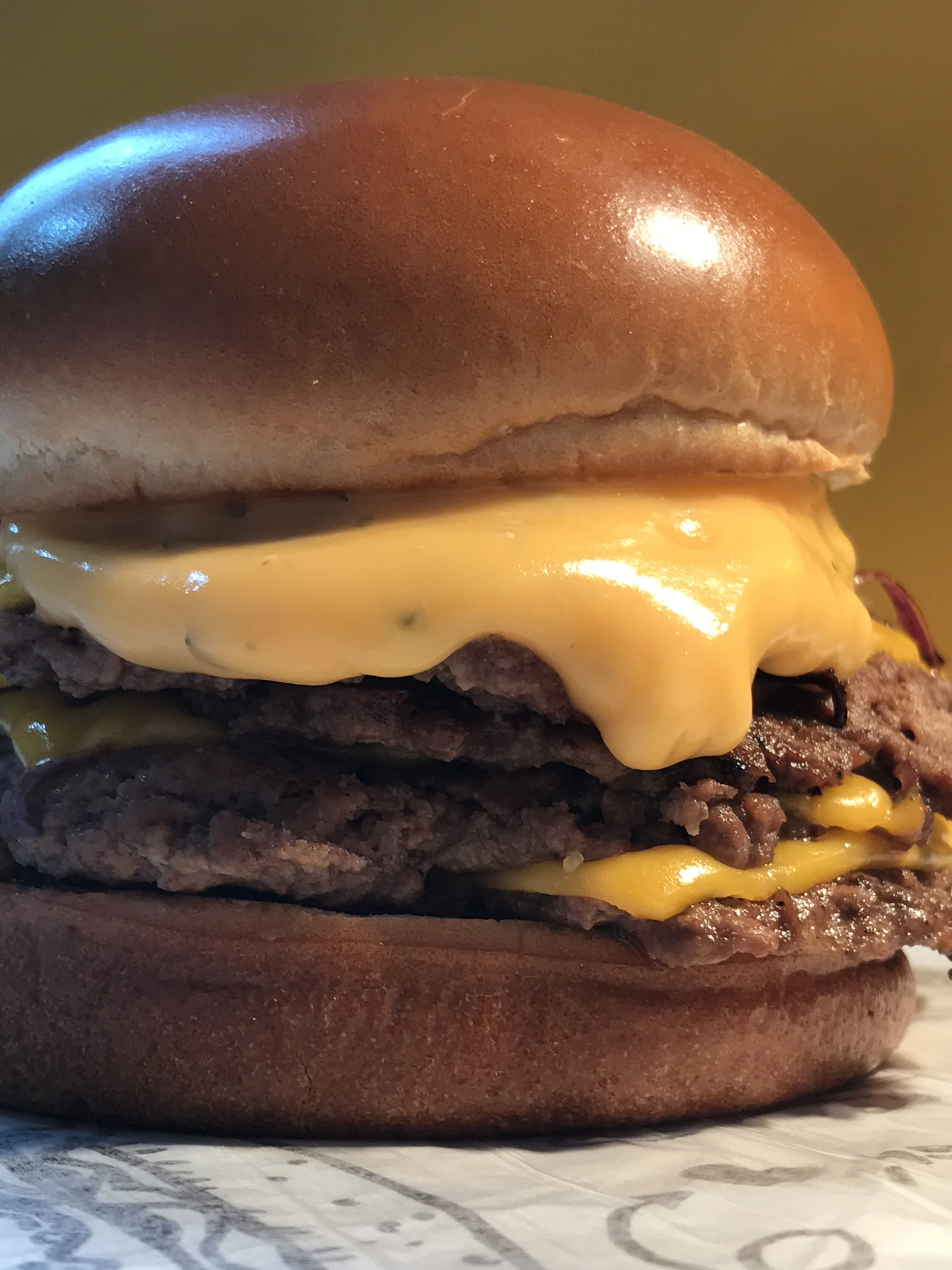 Pãozinho Brioche, 4 Blends perfeitos, muita cebola roxa, fatias de queijo cheddar e molho especial.